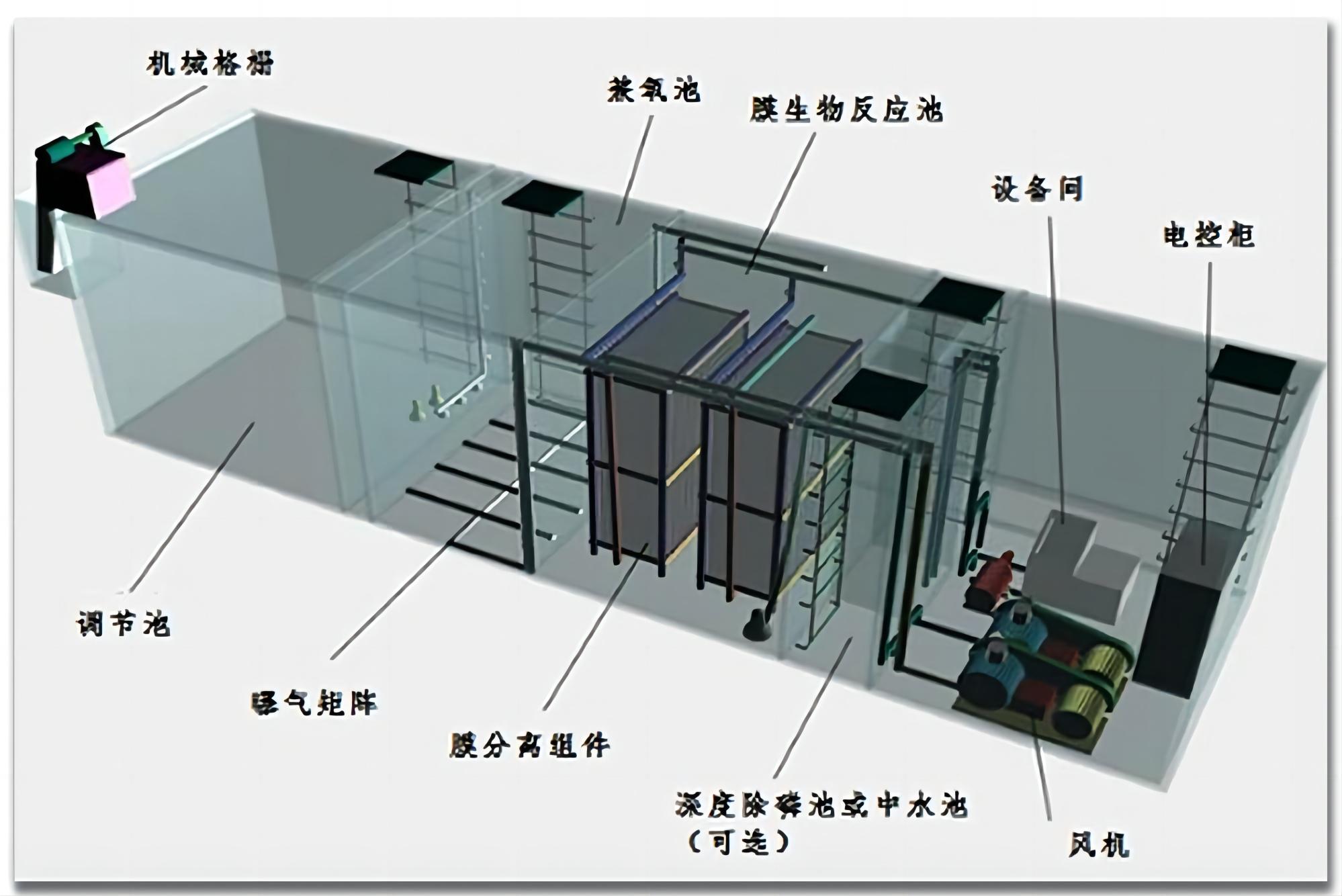 工藝原理:膜生物反應器(MBR)工藝主要由兼氧池、MBR膜生物反應池、深度除磷池等部分組成。通過好氧、厭氧菌的分解作用、中空纖維膜的截留作用、強化除磷填料的吸附作用等實現(xiàn)中水回用或達標排放。